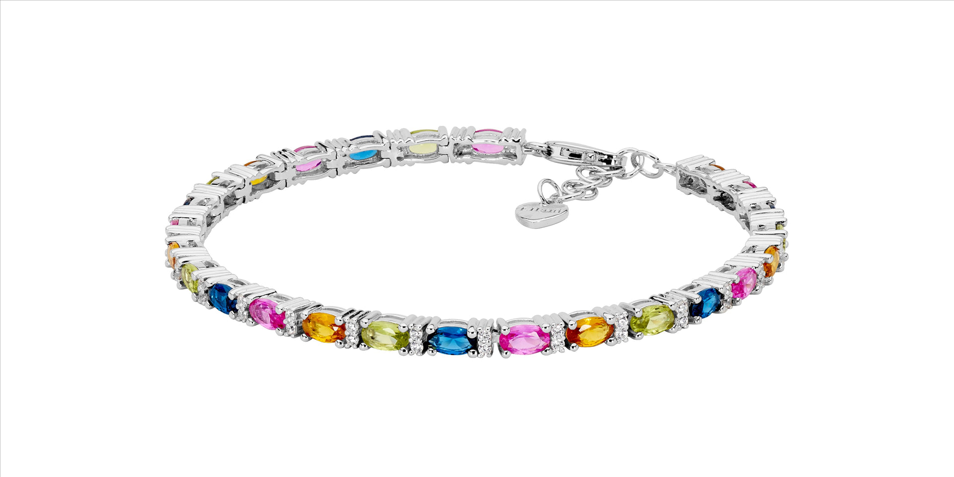 Sterling silver tennis bracelet with a multi-colored design, featuring oval and round cubic zirconia stones. Measures 18cm with an adjustable extension chain.